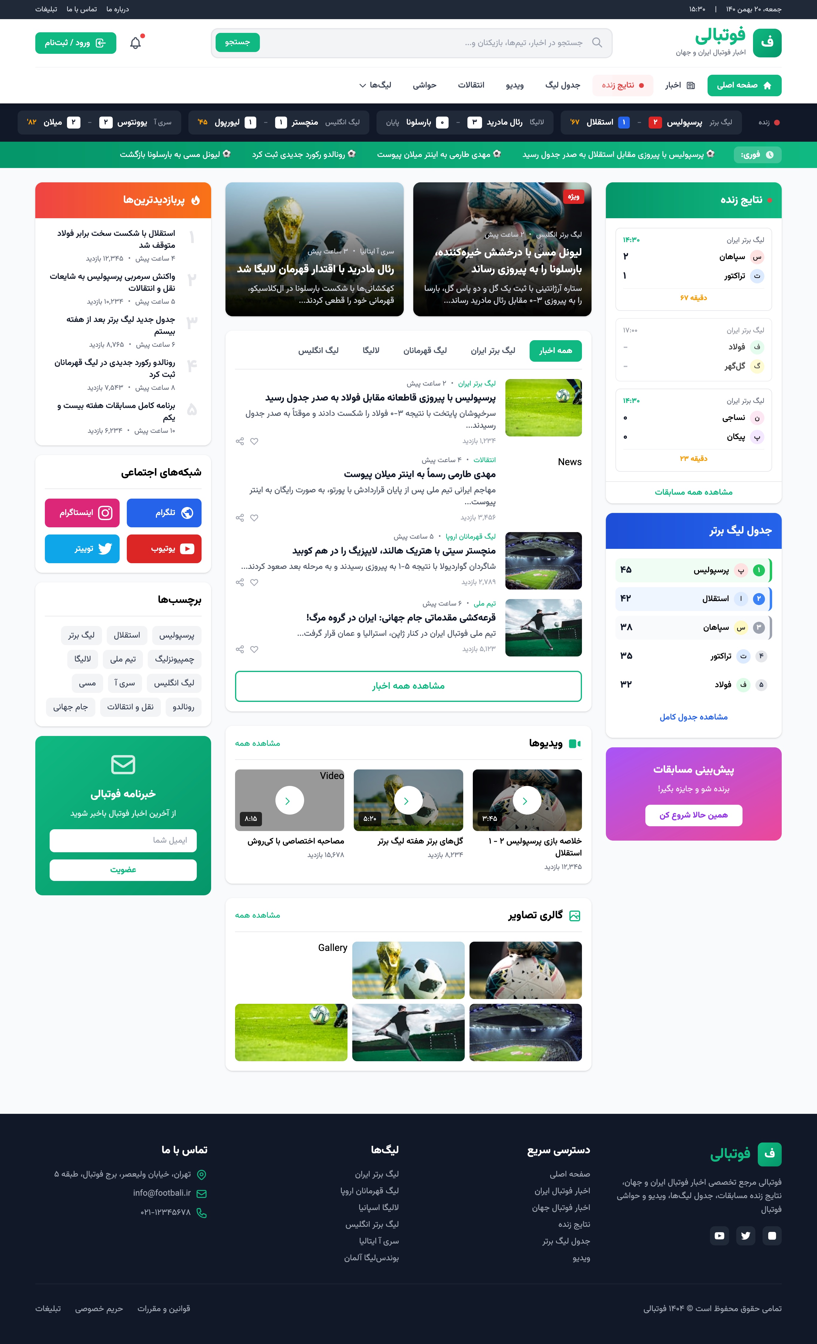 قالب فوتبالی یک قالب HTML,Wordpress,Joomla آماده و کاملاً ریسپانسیو است که به‌طور اختصاصی برای سایت‌های خبری حوزه فوتبال و ورزش طراحی شده است. این قالب با ظاهری مدرن، ساختاری حرفه‌ای و پشتیبانی کامل از زبان فارسی و چیدمان RTL، بهترین انتخاب برای راه‌اندازی یک پایگاه خبری ورزشی است.